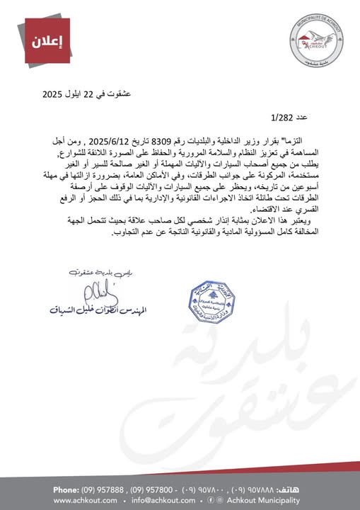 بيان صادر عن بلدية عشقوت يقضي بإزالة جميع السيارات و الآليات المهملة أو غير الصالحة للسير المركونة على جوانب الطريق