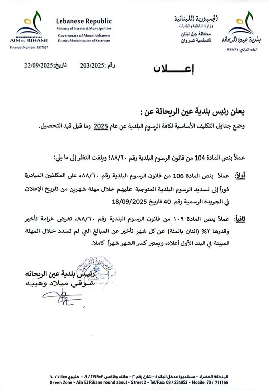 أولاً: عملاً بنص المادة 106 من قانون الرسوم البلدية رقم ٨٨/٦٠، على المكلفين المبادرة فوراً إلى تسديد الرسوم البلدية المتوجبة عليهم خلال مهلة شهرين من تاريخ الإعلان في الجريدة الرسمية رقم 40 تاريخ 18/09/2025