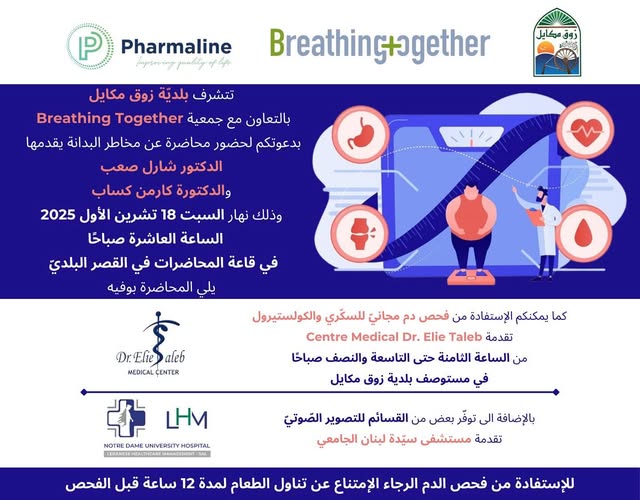 تنظّم بلدية زوق مكايل، بالتعاون مع جمعية Breathing Together، محاضرة توعوية حول مخاطر البدانة، وذلك يوم السبت ١٨ تشرين الأول ٢٠٢٥ ابتداءً من الساعة الثامنة صباحًا.